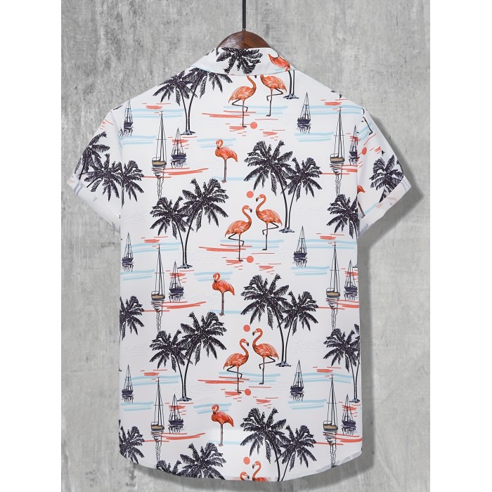 Men's Shirt Top, Flamingo & Coconut Tree Print, Camp Collar Bowling Shirts Short Sleeve Closure Summer Hawaiian Shirt Male Casual Button Up Shirt
